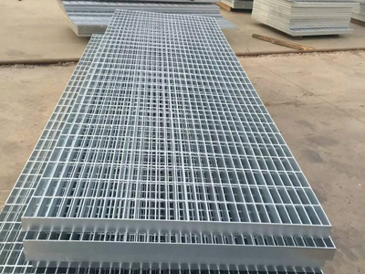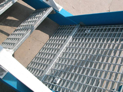 平臺(tái)踏步板是由負(fù)載扁鋼和橫桿按一定間距經(jīng)緯排列,再用高壓電阻焊機(jī)焊接而成原板,經(jīng)切割、切口、開孔、包邊等工序深加工而成客戶要求的成品。